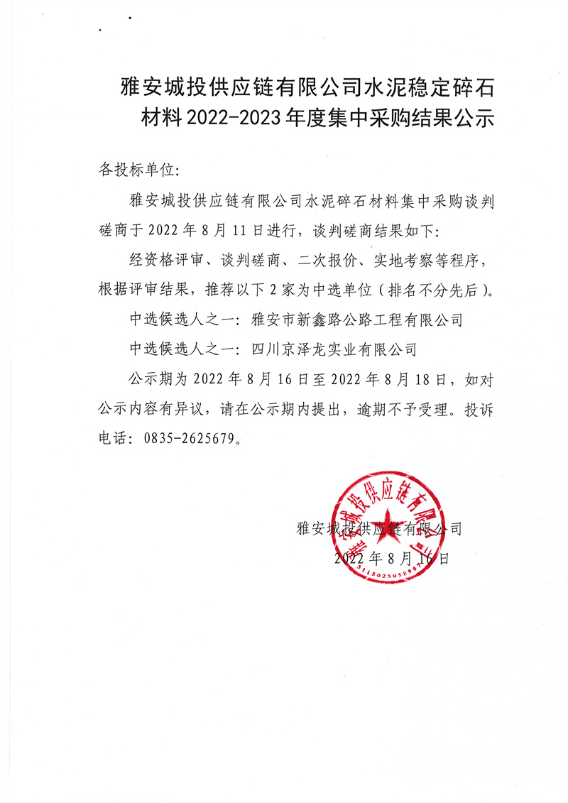 雅安城投供應(yīng)鏈有限公司水泥穩(wěn)定碎石材料2022-2023年度集中采購結(jié)果公示