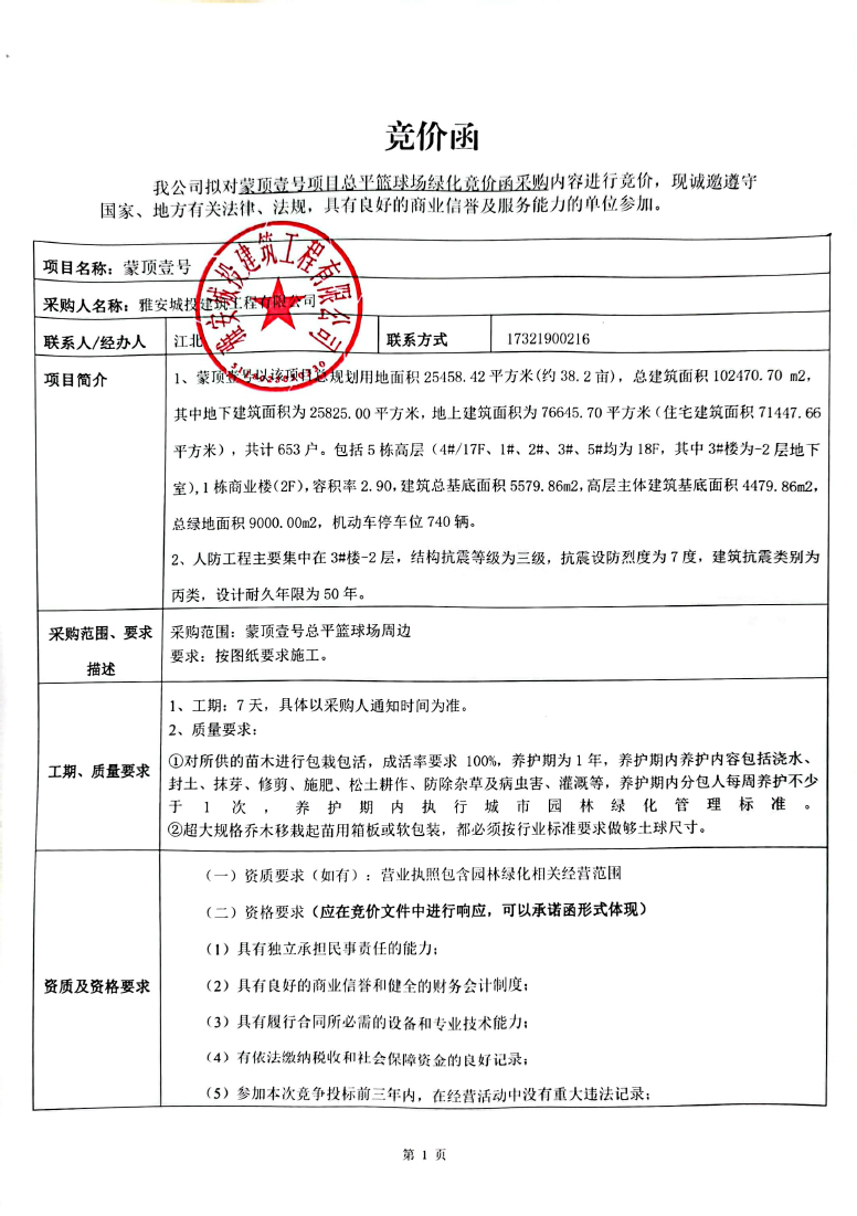 蒙頂壹號項(xiàng)目總平籃球場綠化競價公告