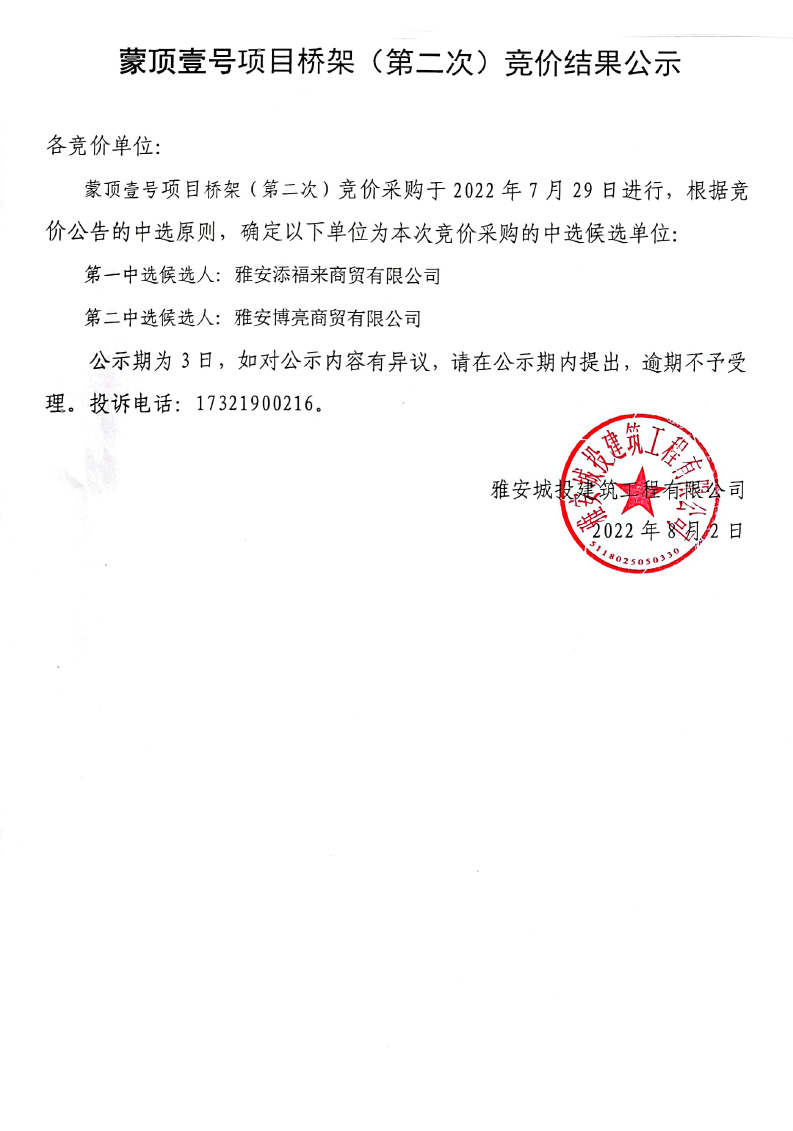 蒙頂壹號項目橋架(第二次)競價結(jié)果公示