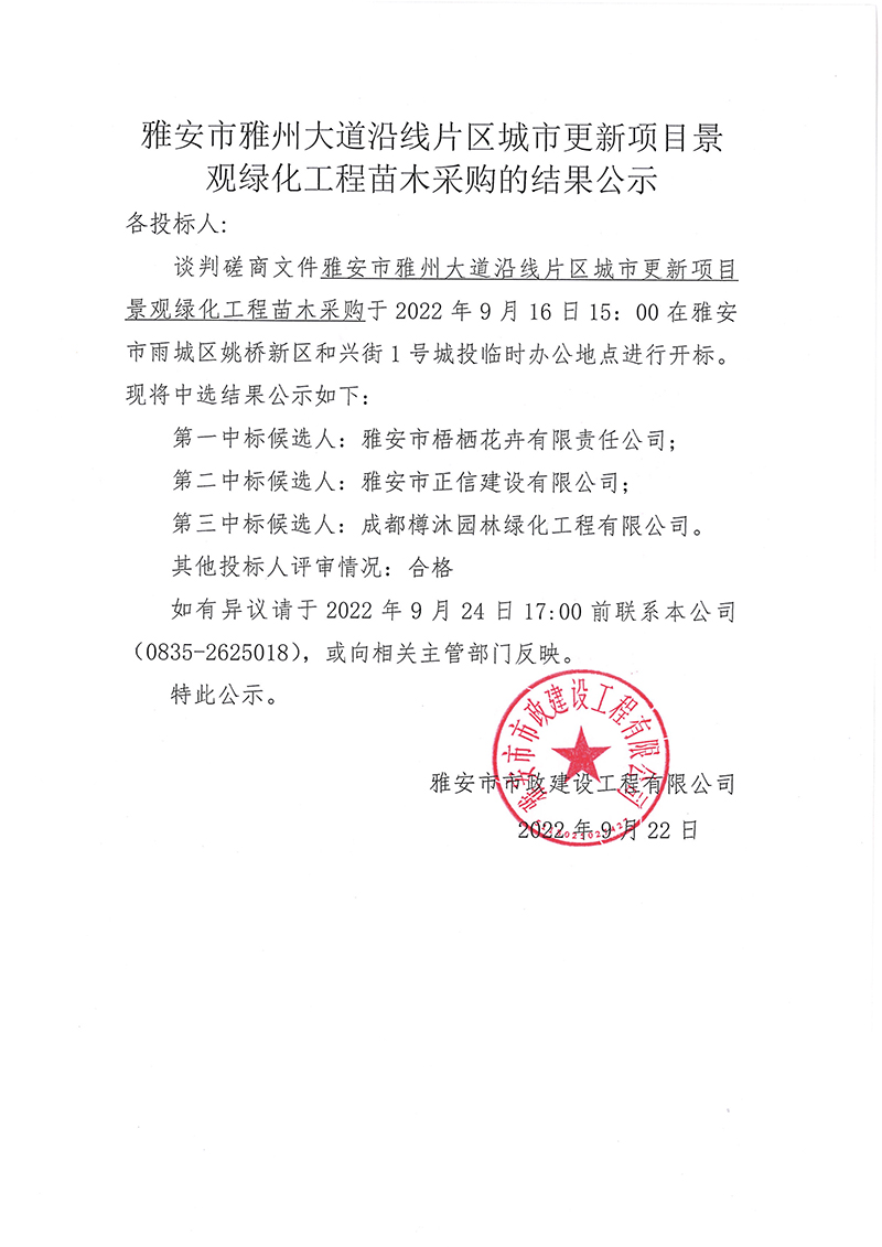 雅安市雅州大道沿線(xiàn)片區(qū)城市更新項(xiàng)目景觀(guān)綠化工程苗木采購(gòu)的結(jié)果公示