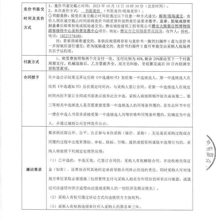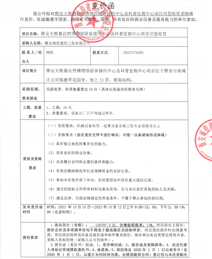 雅安大熊貓自然博物館游客接待中心及科普宣教中心項(xiàng)目吊籃租賃采購競價公告