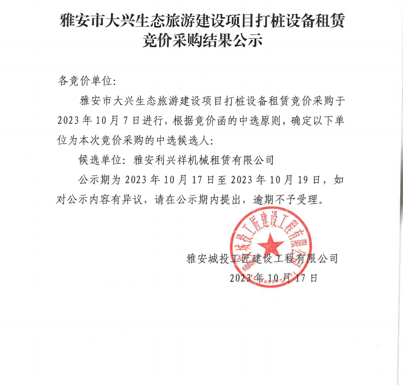 雅安市大興生態(tài)旅游建設項目打樁設備租賃競價采購結(jié)果公示