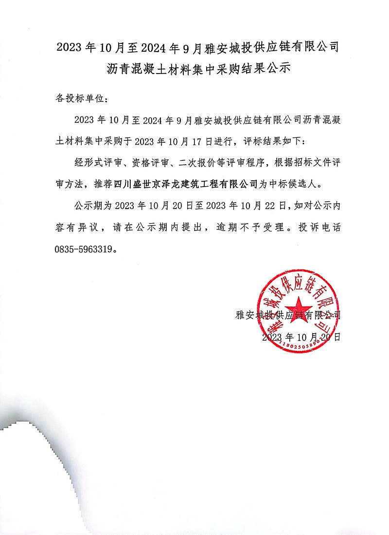 2023年10月至2024年9月雅安城投供應鏈有限公司瀝青混凝土材料集中采購結果公示