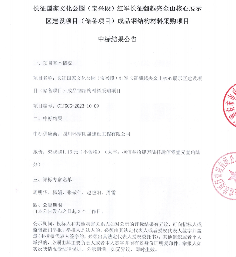 長征國家文化公園(寶興段)紅軍長征翻越夾金山核心展示區(qū)建設(shè)項(xiàng)目(儲備項(xiàng)目)成品鋼結(jié)構(gòu)材料采購項(xiàng)目中標(biāo)結(jié)果公告