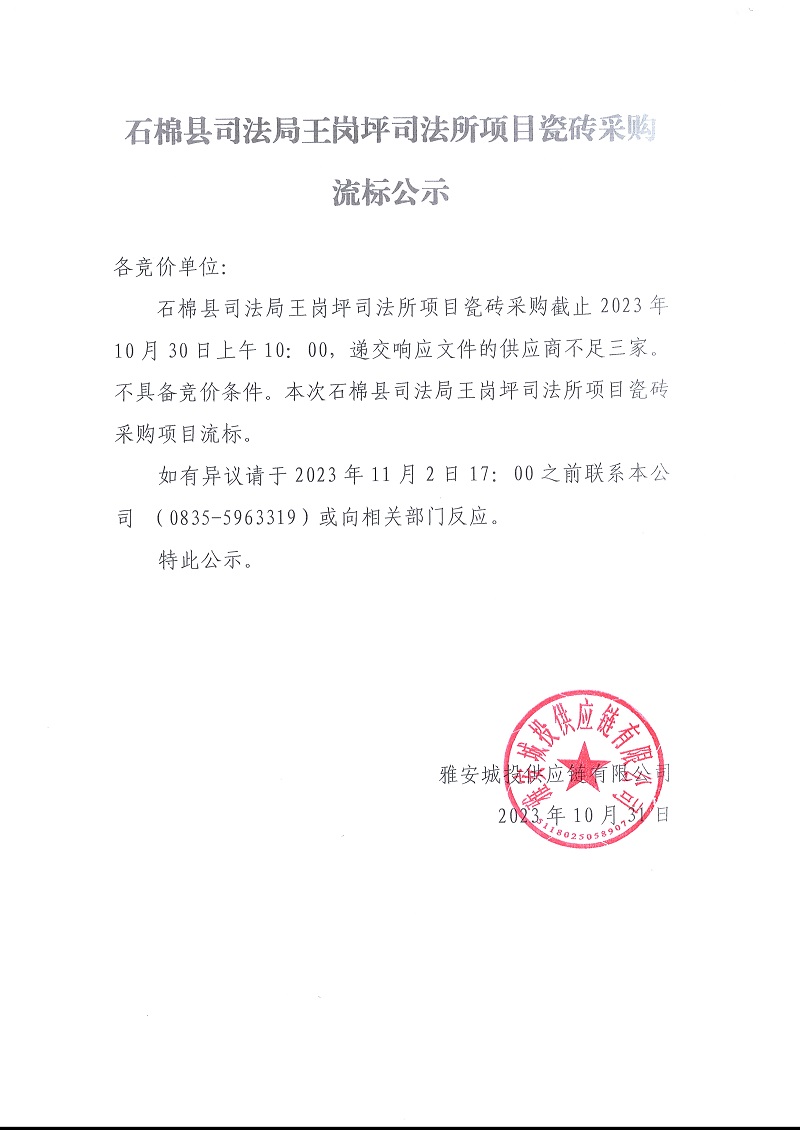 石棉縣司法局王崗坪司法所項目瓷磚采購流標(biāo)公示