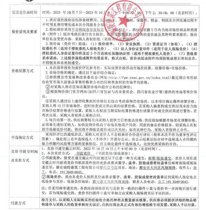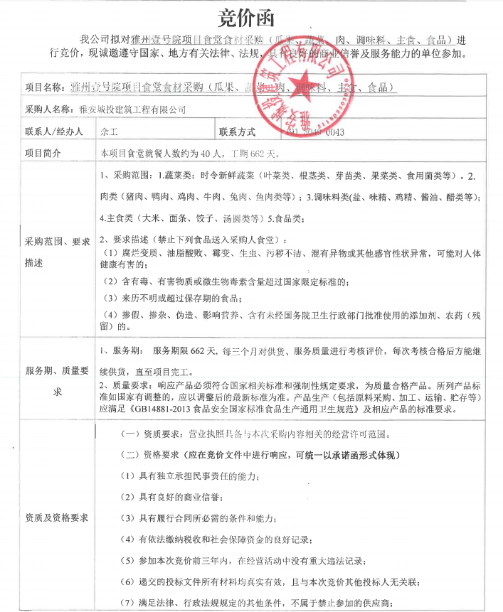 雅州壹號院項目食堂食材采購(瓜果、蔬菜、肉、調(diào)味料、主食、食品)競價公告