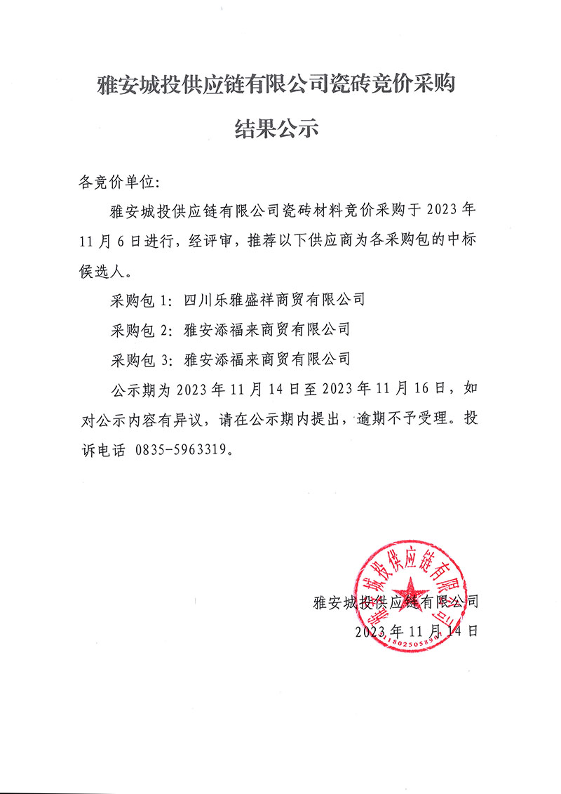 雅安城投供應(yīng)鏈有限公司瓷磚競(jìng)價(jià)采購(gòu)結(jié)果公示