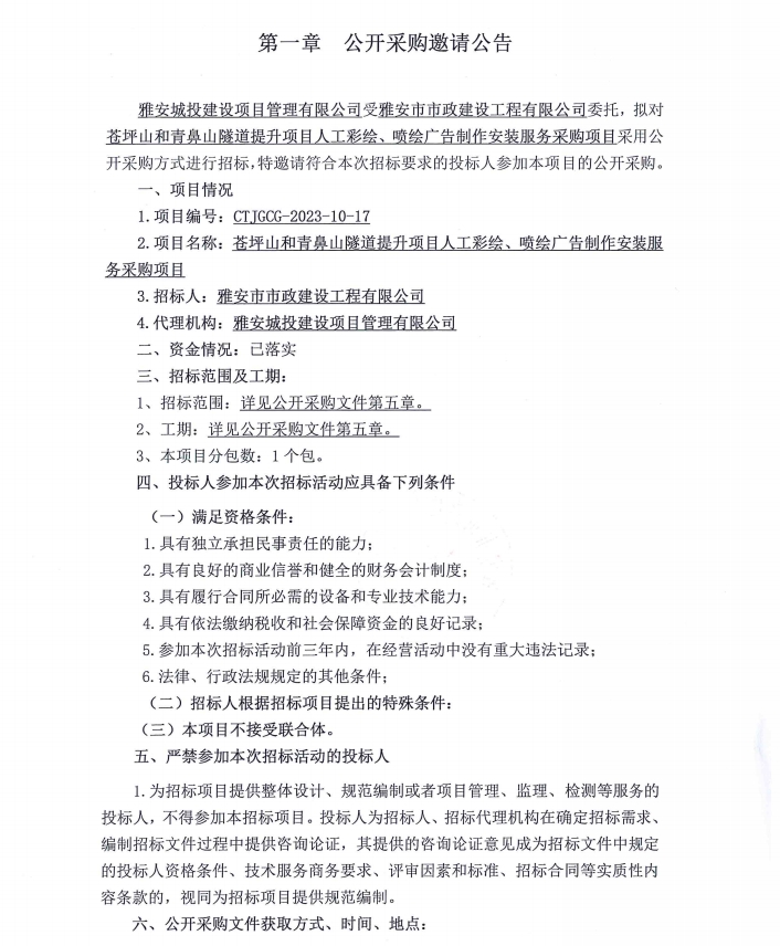蒼坪山和青鼻山隧道提升項目人工彩繪、噴繪廣告制作安裝服務采購項目公開采購邀請公告
