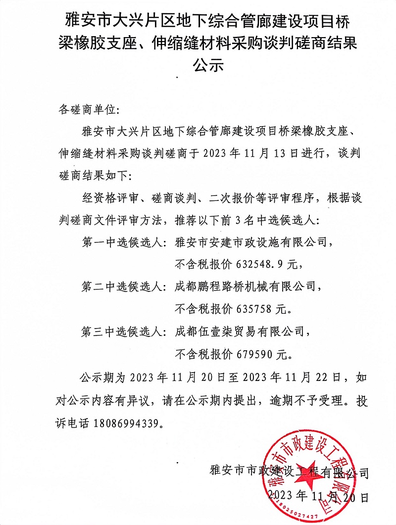 雅安市大興片區(qū)地下綜合管廊建設項目橋梁橡膠支座、伸縮縫材料采購談判磋商結果公示