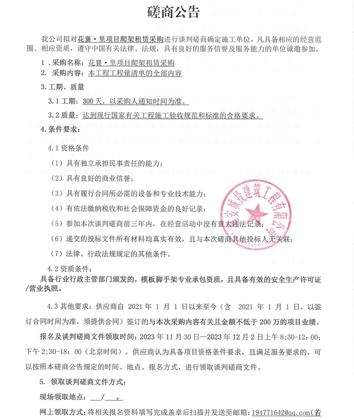 花襄·里項(xiàng)目爬架租賃采購磋商公告