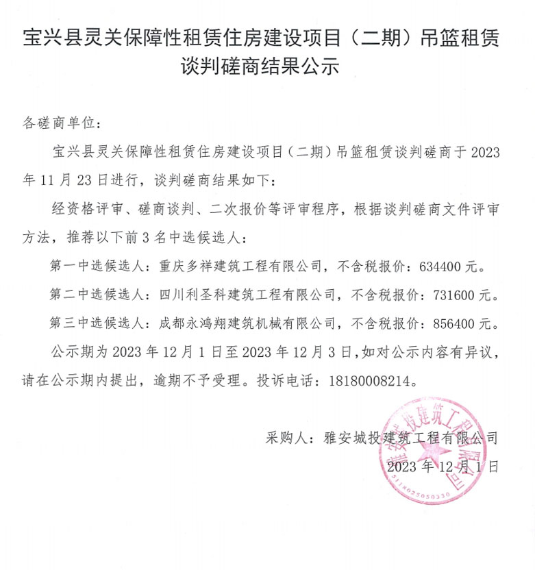寶興縣靈關(guān)保障性租賃住房建設(shè)項(xiàng)目(二期)吊籃租賃談判磋商結(jié)果公示