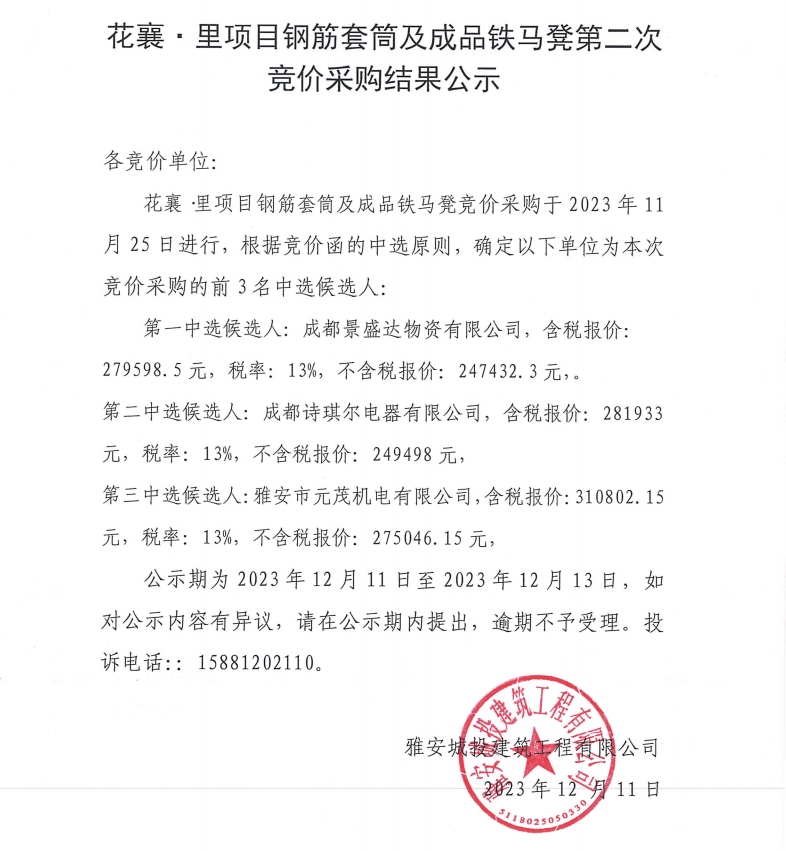 花襄·里項目鋼筋套筒及成品鐵馬凳第二次競價采購結(jié)果公示