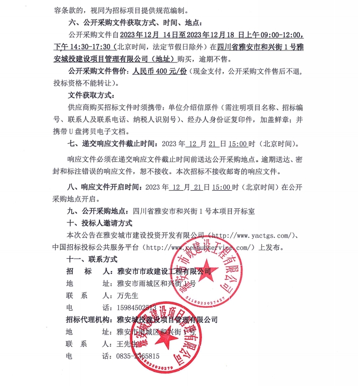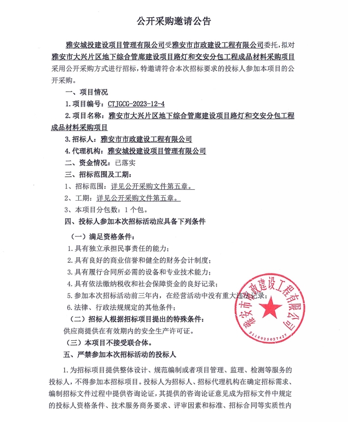 雅安市大興片區(qū)地下綜合管廊建設(shè)項(xiàng)目路燈和交安分包工程成品材料采購(gòu)項(xiàng)目公開采購(gòu)邀請(qǐng)公告