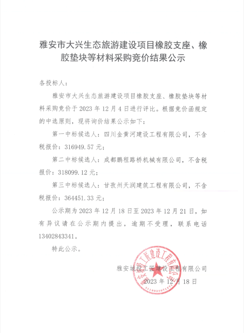 雅安市大興生態(tài)旅游建設(shè)項目橡膠支座、橡膠墊塊等材料采購競價結(jié)果公示