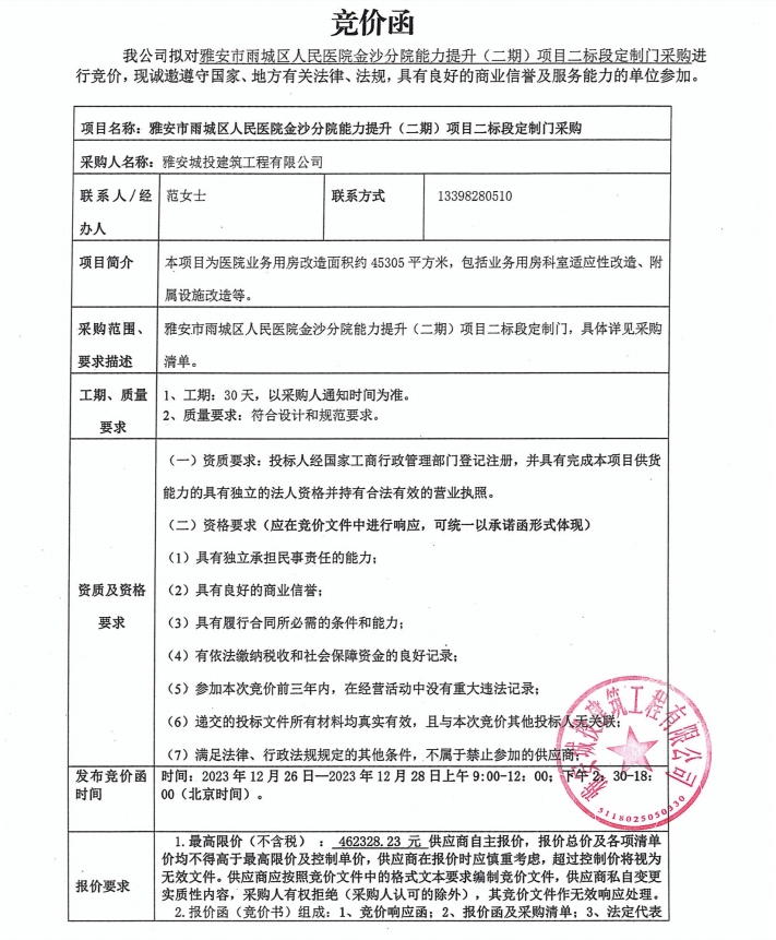 雅安市雨城區(qū)人民醫(yī)院金沙分院能力提升(二期)項(xiàng)目二標(biāo)段定制門(mén)采購(gòu)競(jìng)價(jià)公告