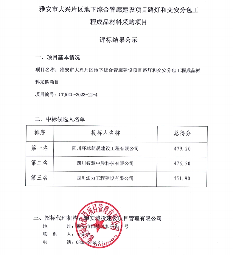 雅安市大興片區(qū)地下綜合管廊建設(shè)項(xiàng)目路燈和交安分包工程成品材料采購項(xiàng)目評標(biāo)結(jié)果公示