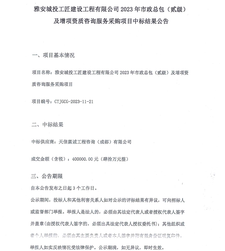雅安城投工匠建設(shè)工程有限公司2023年市政總包(貳級)及增項(xiàng)資質(zhì)咨詢服務(wù)采購項(xiàng)目中標(biāo)結(jié)果公告