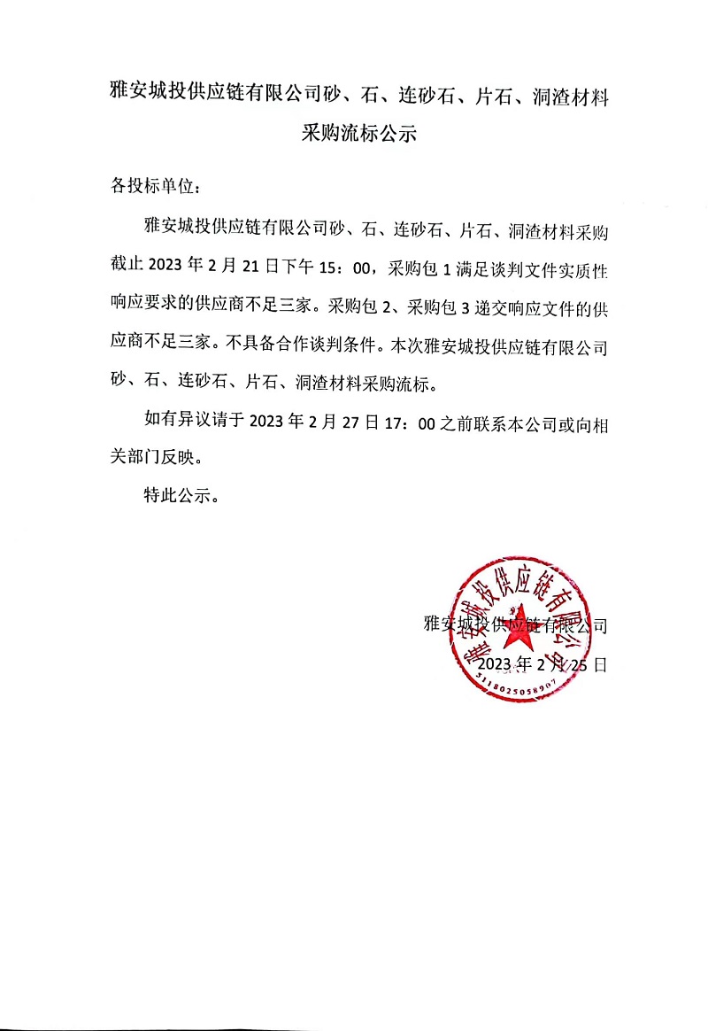 雅安城投供應(yīng)鏈有限公司砂、石、連砂石、片石、洞渣材料采購流標公示