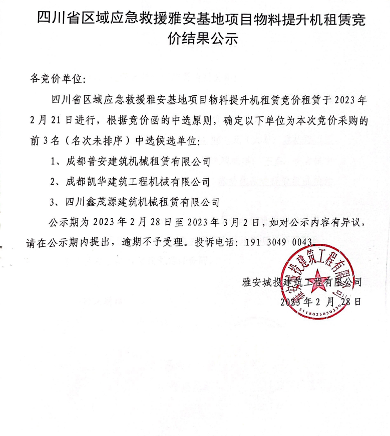 四川省區(qū)域應(yīng)急救援雅安基地項目物料提升機租賃競價結(jié)果公示