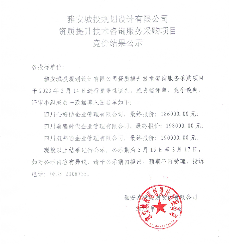 雅安城投規(guī)劃設(shè)計(jì)有限公司資質(zhì)提升技術(shù)咨詢服務(wù)采購(gòu)項(xiàng)目競(jìng)價(jià)結(jié)果公示