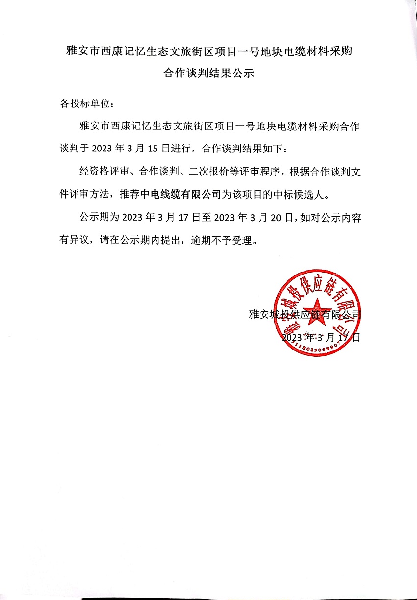 雅安市西康記憶生態(tài)文旅街區(qū)項(xiàng)目一號(hào)地塊電纜材料采購合作談判結(jié)果公示