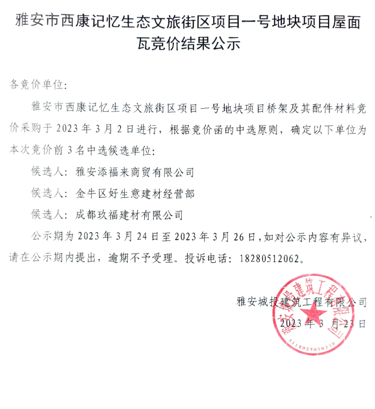 雅安市西康記憶生態(tài)文旅街區(qū)項目一號地塊項目屋面瓦競價結果公示