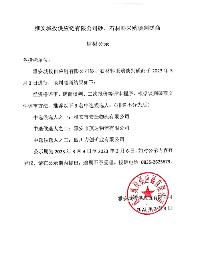 雅安城投供應鏈有限公司砂、石材料采購談判磋商結果公示