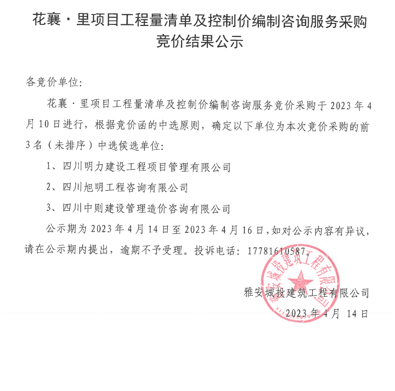 花襄·里項(xiàng)目工程量清單及招標(biāo)控制價編制咨詢服務(wù)采購競價結(jié)果公示