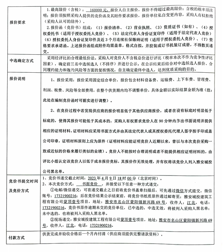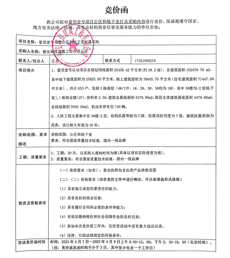 蒙頂壹號項目公區(qū)和地下室燈具采購競價公告