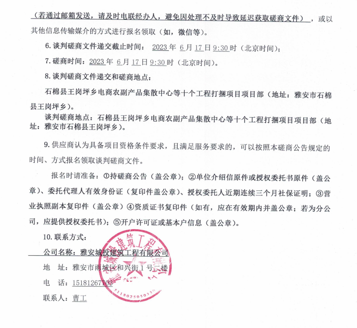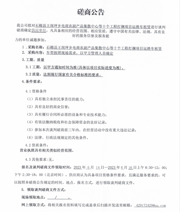 石棉縣王崗坪鄉(xiāng)電商農(nóng)副產(chǎn)品集散中心等十個(gè)工程打捆項(xiàng)目運(yùn)渣車租賃談判磋商公告