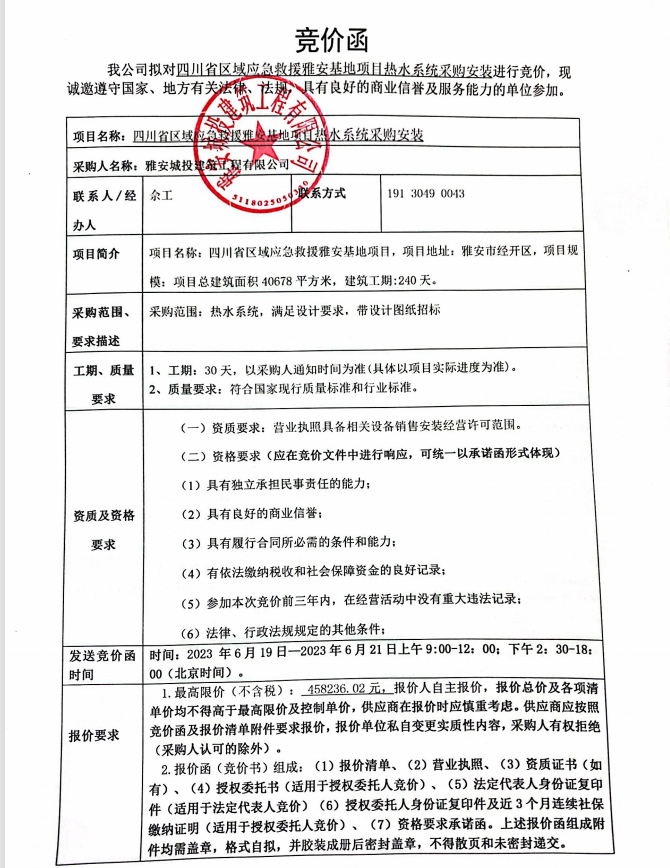 四川省區(qū)域應(yīng)急救援雅安基地項(xiàng)目熱水系統(tǒng)采購安裝競(jìng)價(jià)公告