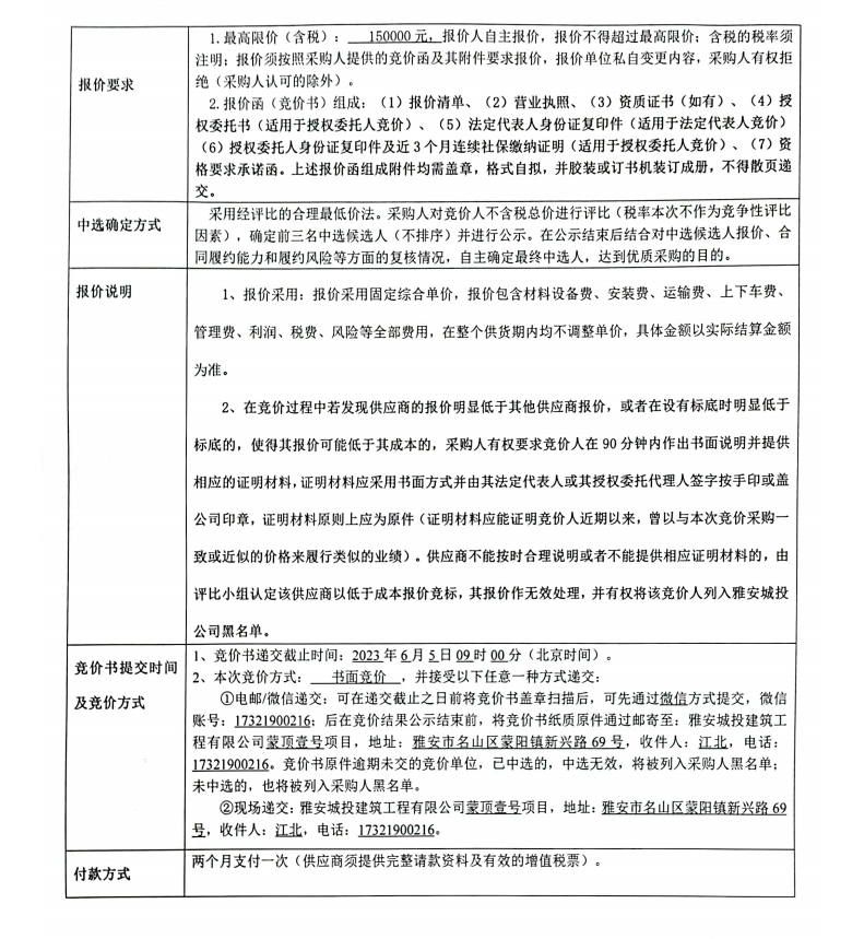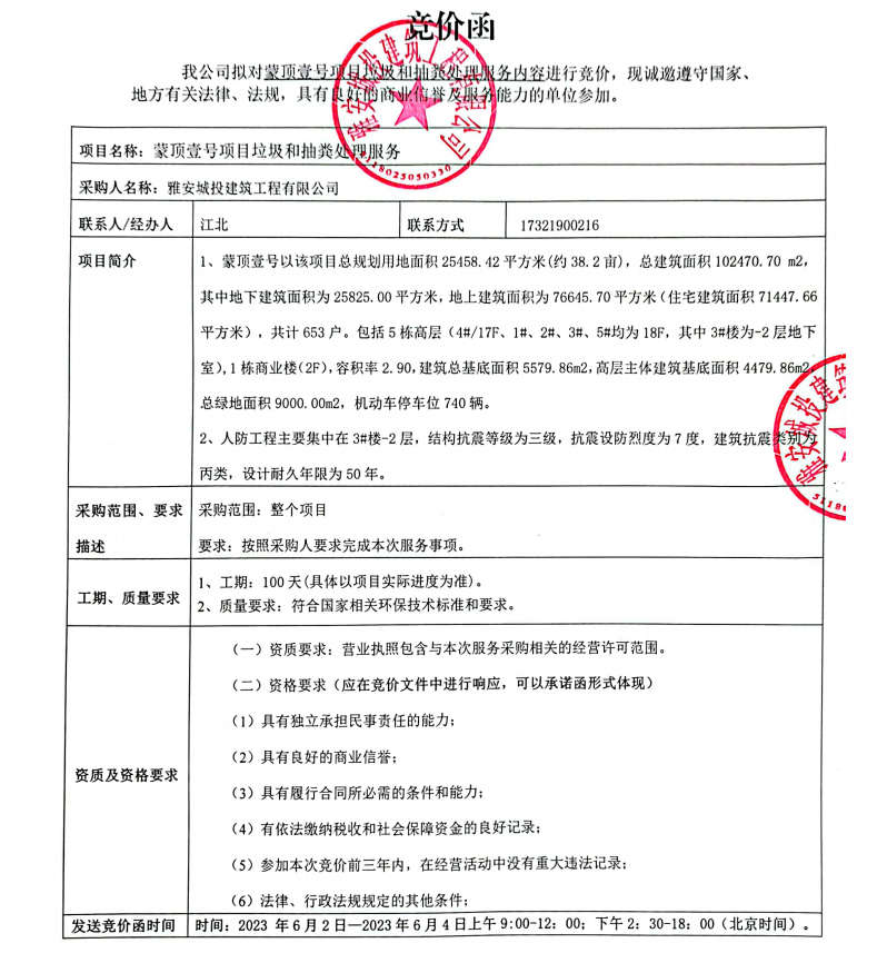 蒙頂壹號項目垃圾和抽糞處理服務(wù)競價公告