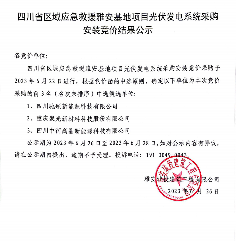 四川省區(qū)域應(yīng)急救援雅安基地項(xiàng)目光伏發(fā)電系統(tǒng)采購安裝競價(jià)結(jié)果公示