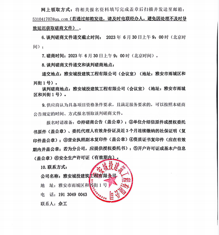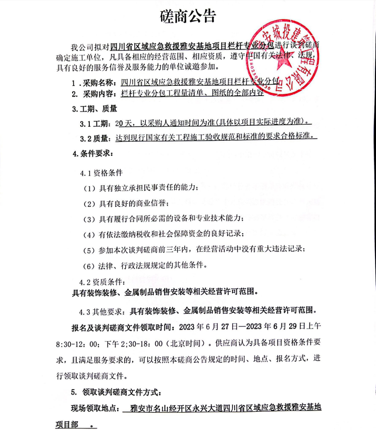 四川省區(qū)域應(yīng)急救援雅安基地項(xiàng)目欄桿專業(yè)分包談判磋商公告