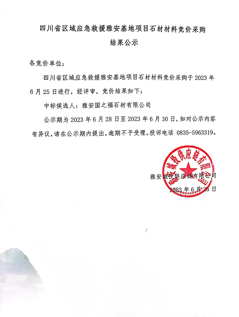 四川省區(qū)域應(yīng)急救援雅安基地項(xiàng)目石材材料競價(jià)采購結(jié)果公示