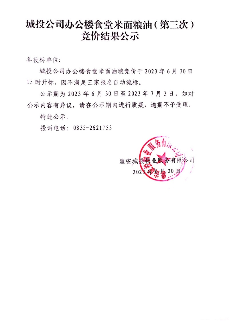城投公司辦公樓食堂米面糧油(第三次)競(jìng)價(jià)結(jié)果公示
