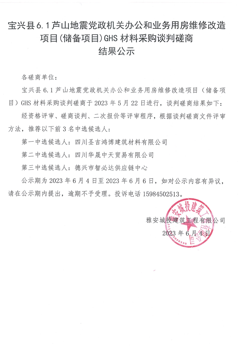 寶興縣6.1蘆山地震黨政機關(guān)辦公和業(yè)務用房維修改造項目(儲備項目)GHS材料采購談判磋商結(jié)果公示