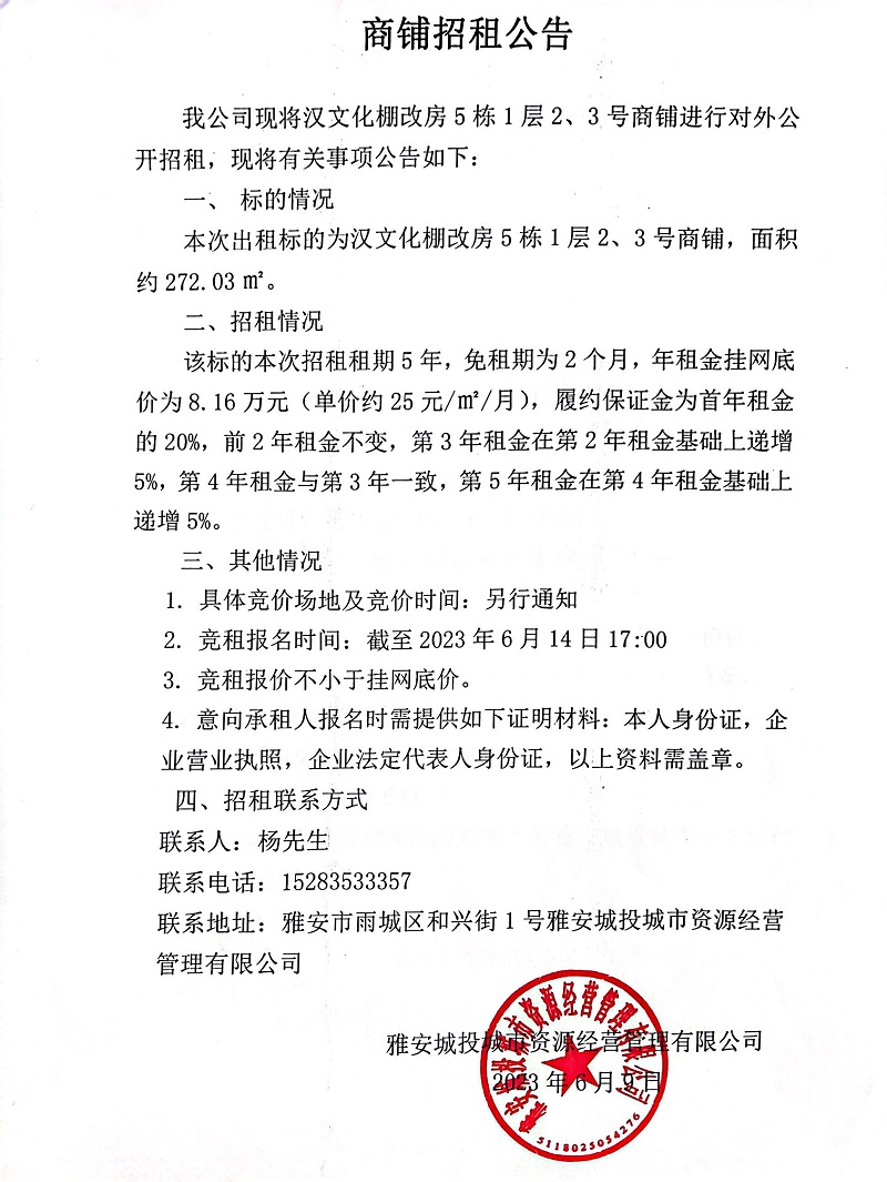 漢文化棚改房5棟1層2、3號商鋪招租公告