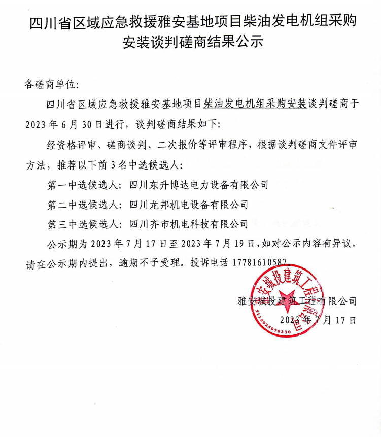 四川省區(qū)域應急救援雅安基地項目柴油發(fā)電機組采購安裝談判磋商結果公示