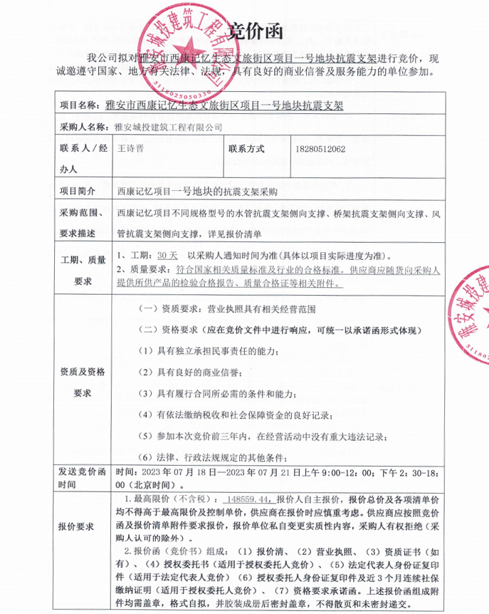 雅安市西康記憶生態(tài)文旅街區(qū)項(xiàng)目一號(hào)地塊抗震支架競價(jià)采購公告