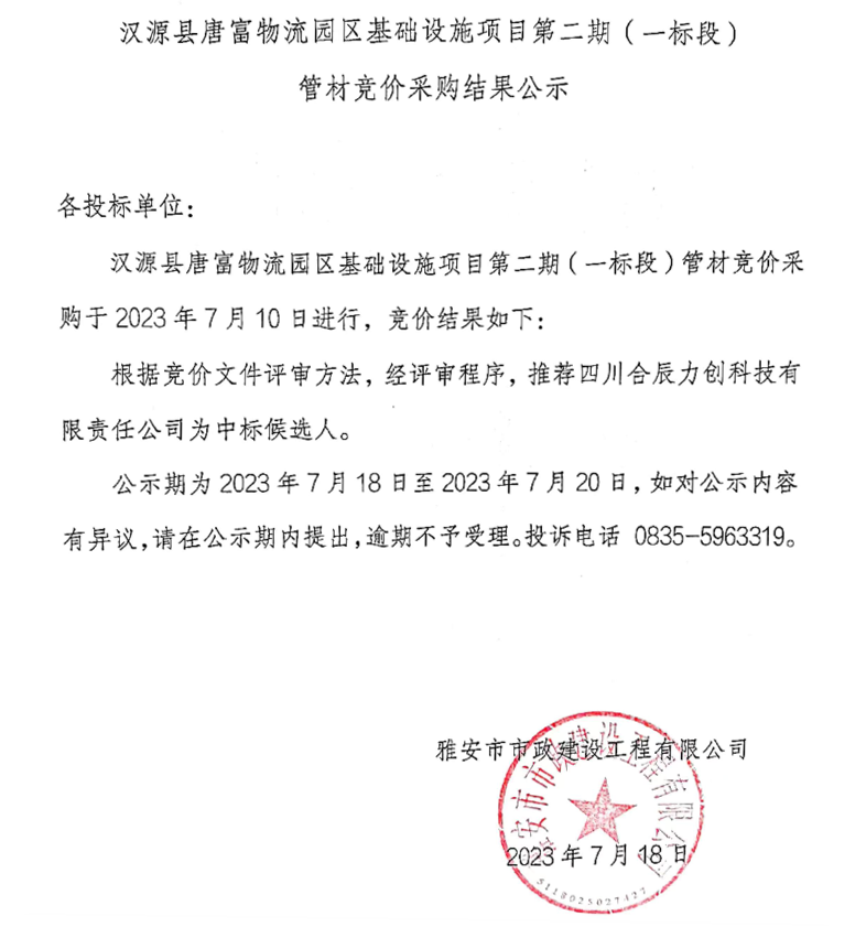 漢源縣唐富物流園區(qū)基礎設施項目二期(一標段)管材競價采購結果公示