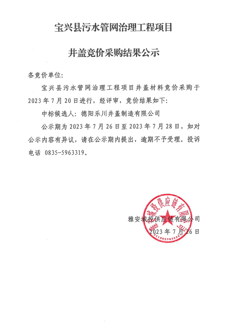 寶興縣污水管網(wǎng)病害治理工程項目井蓋競價采購結(jié)果公示