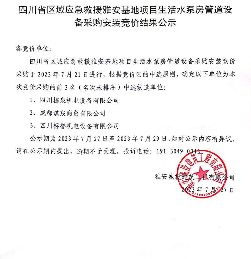 四川省區(qū)域應(yīng)急救援雅安基地項(xiàng)目生活水泵房管道設(shè)備采購安裝競價(jià)結(jié)果公示