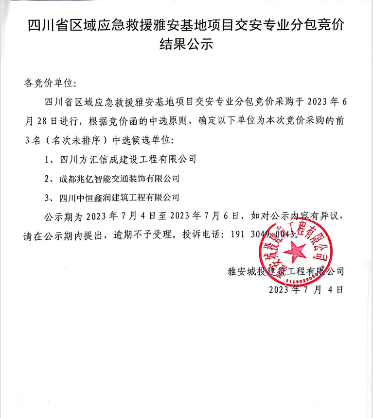 四川省區(qū)域應急救援雅安基地項目交安專業(yè)分包競價結果公示