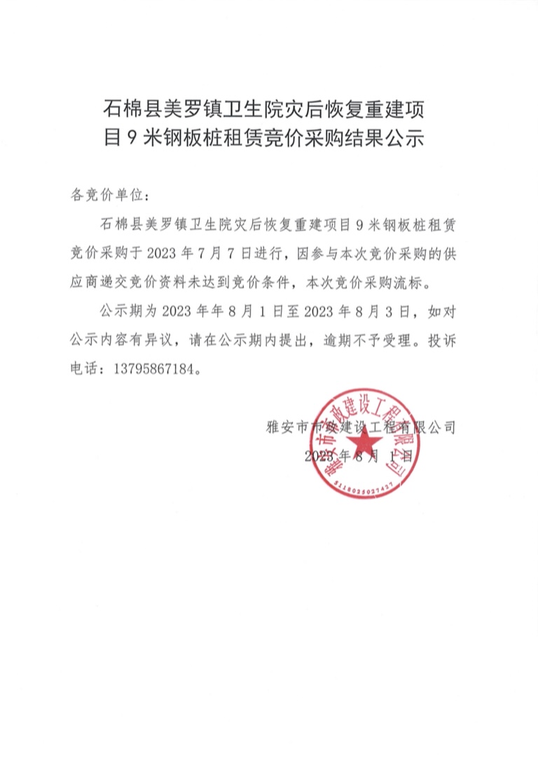 石棉縣美羅鎮(zhèn)衛(wèi)生院災(zāi)后恢復(fù)重建項(xiàng)目9米鋼板樁租賃競價(jià)采購結(jié)果公示