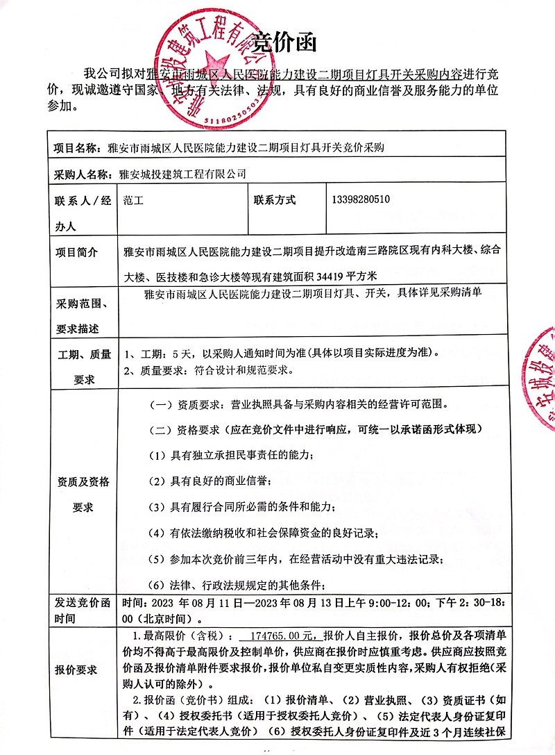 雅安市雨城區(qū)人民醫(yī)院能力建設(shè)二期項(xiàng)目燈具開關(guān)采購競價(jià)公告