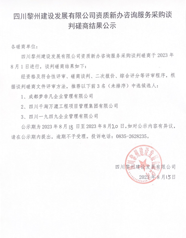 四川黎州建設發(fā)展有限公司資質新辦咨詢服務采購談判磋商結果公示