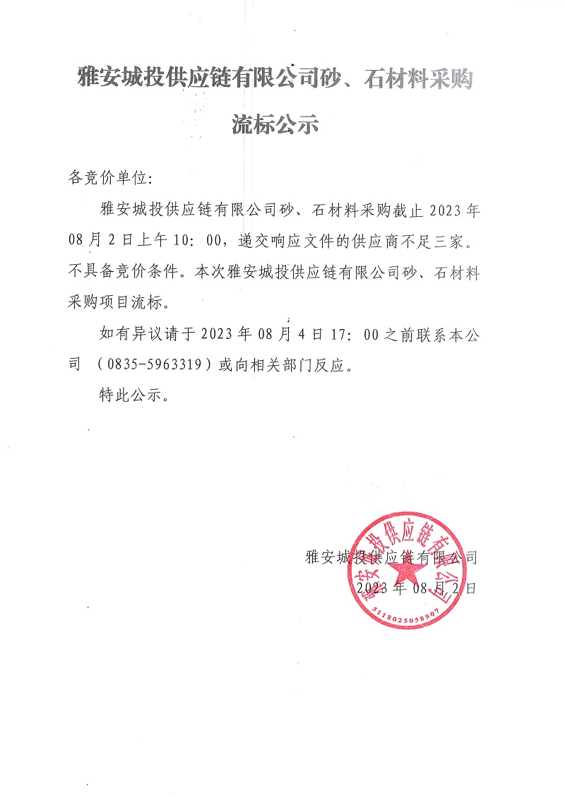 雅安城投供應(yīng)鏈有限公司砂、石材料采購流標公示