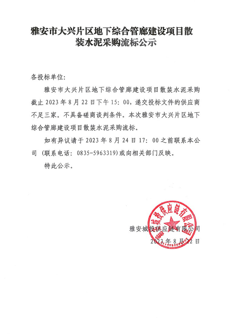 雅安市大興片區(qū)地下綜合管廊建設(shè)項目散裝水泥采購流標(biāo)公示