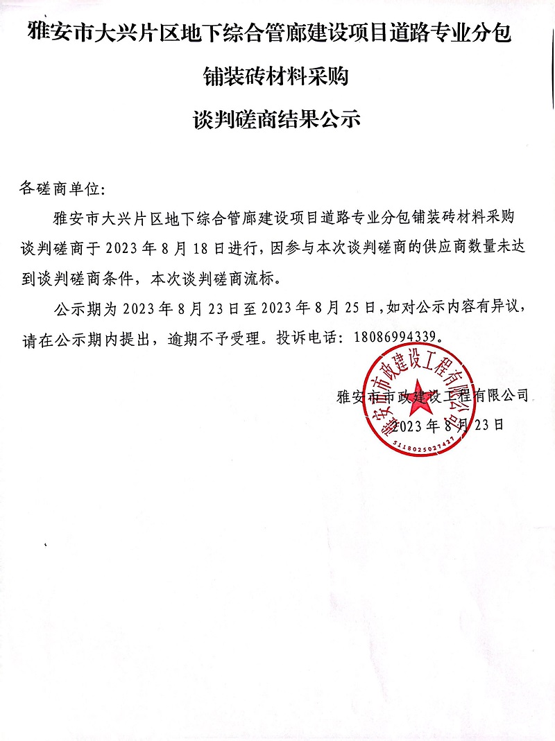 雅安市大興片區(qū)地下綜合管廊建設(shè)項(xiàng)目道路專業(yè)分包鋪裝磚材料采購(gòu)談判磋商結(jié)果公示
